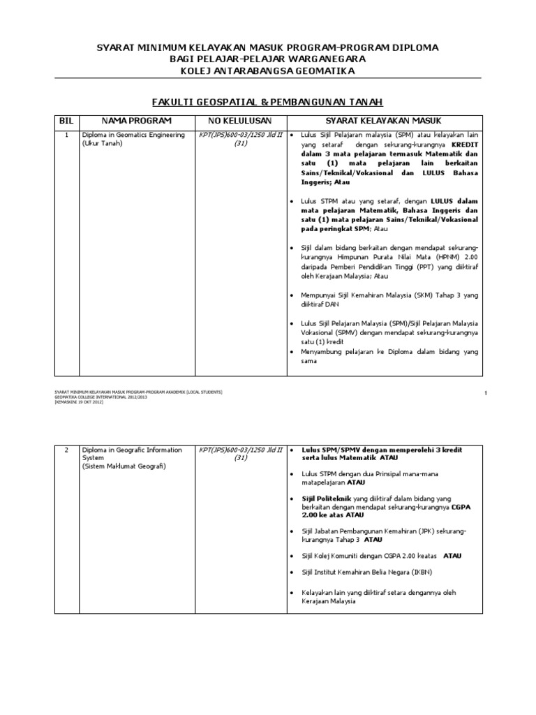 Sijil Pelajaran Malaysia Vokasional SPMSPMV setaraf termasuk subjek. Syarat Umum dan Khusus Program Kolej Vokasional Menjurus Kepada Diploma Bagi Murid Lepasan Pentaksiran. Nama program diploma tempat tempoh syarat 1 diploma in accounting kpm ayer molek melaka kpm bandar penawar johor kpm beranang selangor kpm indera mahkota pahang 2 tahun kemasukan melalui sijil pelajaran malaysia.