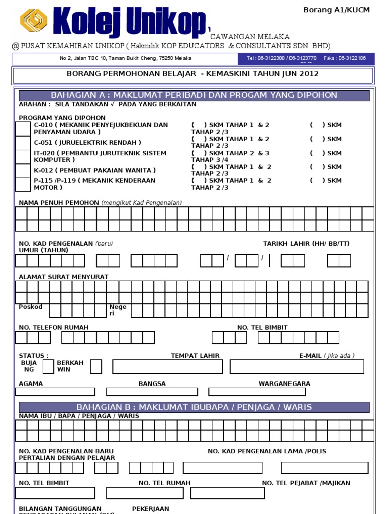 Borang Permohonan Belajar Kolej Unikop Baru 2012 Kemaskini Jun 2012